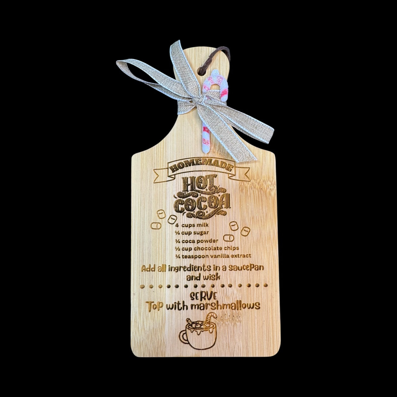 Each board is beautifully detailed with engraved marshmallows, a cocoa mug, and step-by-step recipe instructions — perfect for displaying on your hot cocoa bar, coffee nook, or gifting to the cocoa lover in your life. Finished with a neutral ribbon and candy cane accent, this piece is both decorative and heartwarming.